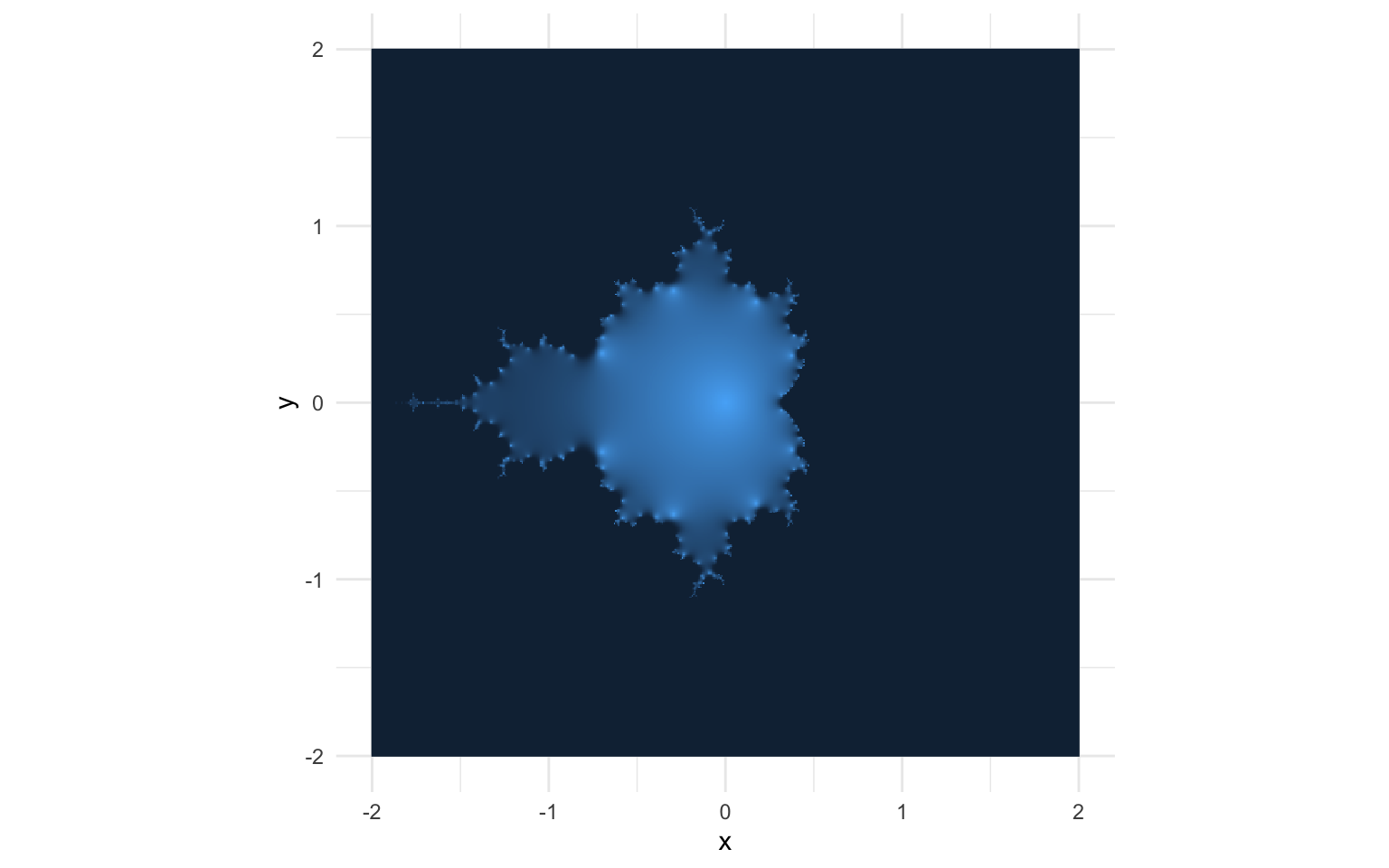 This blog post will employ this duality between recursion and iteration to create images of the Mandelbrot set using R. Although there are plenty of other blog posts that visualize the Mandelbrot set in R,2 I have only seen them implement an iterative approach with a loop. But the Mandelbrot set is mathematically defined with recursion! So we ought to be able to implement a recursive approach that is, hopefully, more succinct and slick.3