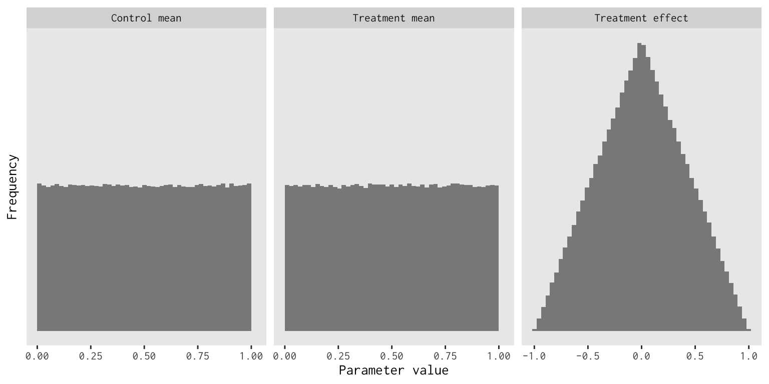 So we started with a flat prior on our group means, and we ended up with a non-trivial prior for the treatment effect. How did this happen? Averaging over my prior uncertainty in both groups, my expected difference in means ought to be mean zero (naturally). But more than that, we get a mode at zero because there are many more ways to obtain mean differences near zero than differences far from zero. We get big differences (near -1 or 0) only when both means are far apart, which isn't as likely to happen randomly as two means that are a little closer together in the prior.