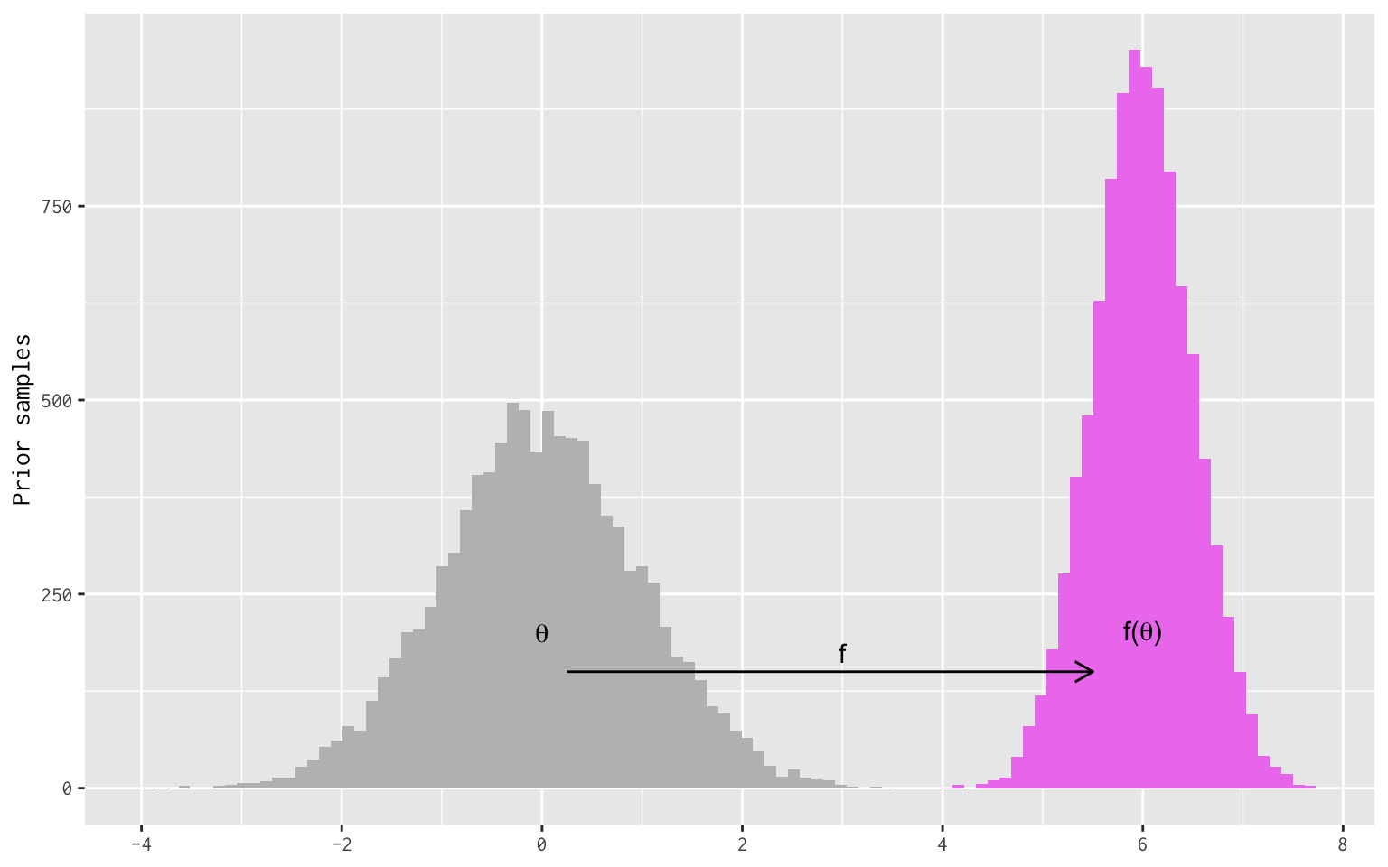 Let's say we have a model parameter, , and we represent our uncertainty about this parameter with a probability distribution. As far as our model is concerned, therefore, is a random variable. If we pass to some function , then the value is also a random variable with its own distribution. We can call the distribution of its "implied prior". You may hear others call it an "induced" prior.