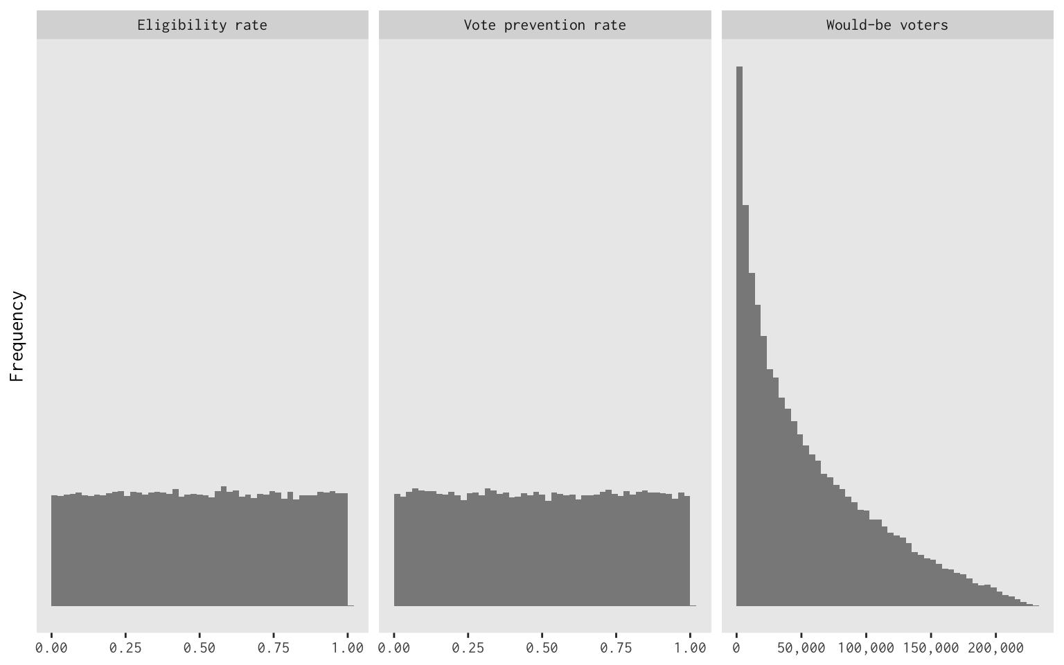 There are two parameters that would be helpful to know. First, not every nonvoter in the voter file was eligible to vote at their registered address at the time of the election. Many registrants move away, die, change their names, etc., so only some fraction of the nonvoters (say, ) were eligible to vote as registered in 2016. So that's one parameter; call it the "eligibity rate". Next, of the eligible nonvoters, another proportion would have voted if not for the voter identification requirement. Call this the "vote prevention rate". Our quantity of interest is the total number of voters who would have otherwise voted, which is calculated as , and we only know .