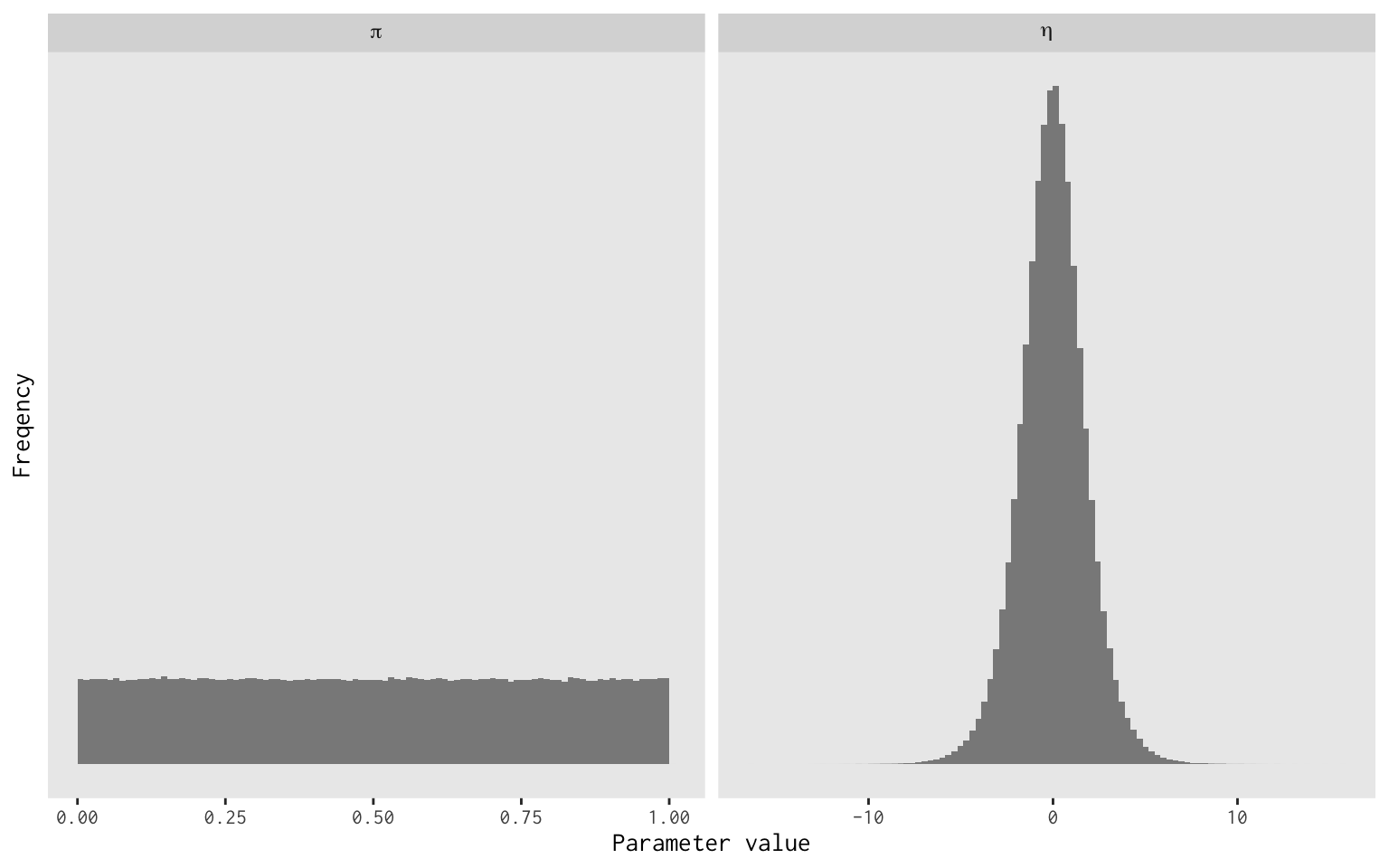 This means and are parameters to be estimated. Let's say we give these parameters independent, flat priors on the interval; what would be the implied prior for ? Let's simulate it again. We use a prior for each probability parameter. The Beta family is commonly used to model unknown probabilities3, and the prior is a special case that gives flat density to all probability values. But when we multiply all of these terms together, the result will not be flat at all.